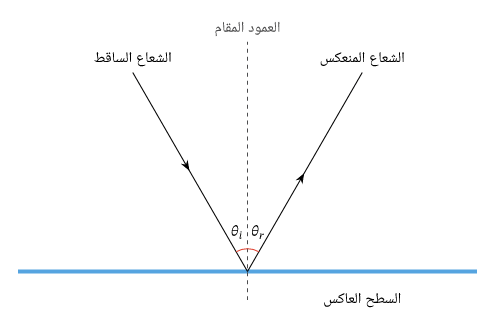 كما ينص ذلك القانون على أن الشعاع الساقط والشعاع المنعكس وكذلك العمود الناتج عن عملية الانعكاس على السطح العاكس من نقطة سقوط الشعاع الضوئي توجد كلها في مستوى واحد بشكل تام.